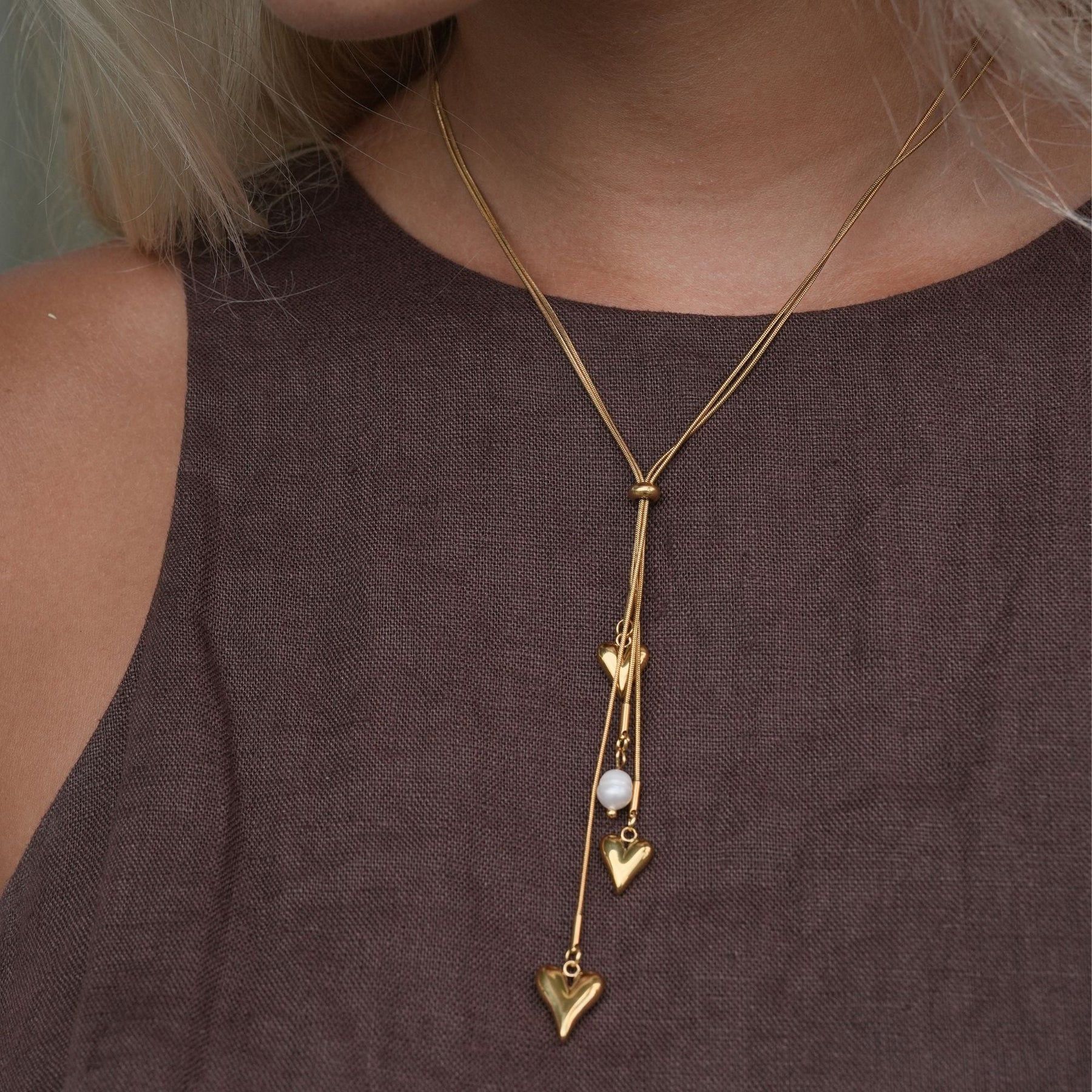 - Design: Features multiple polished heart charms and a single, natural freshwater pearl accent on a dual snake-chain lariat drop.
