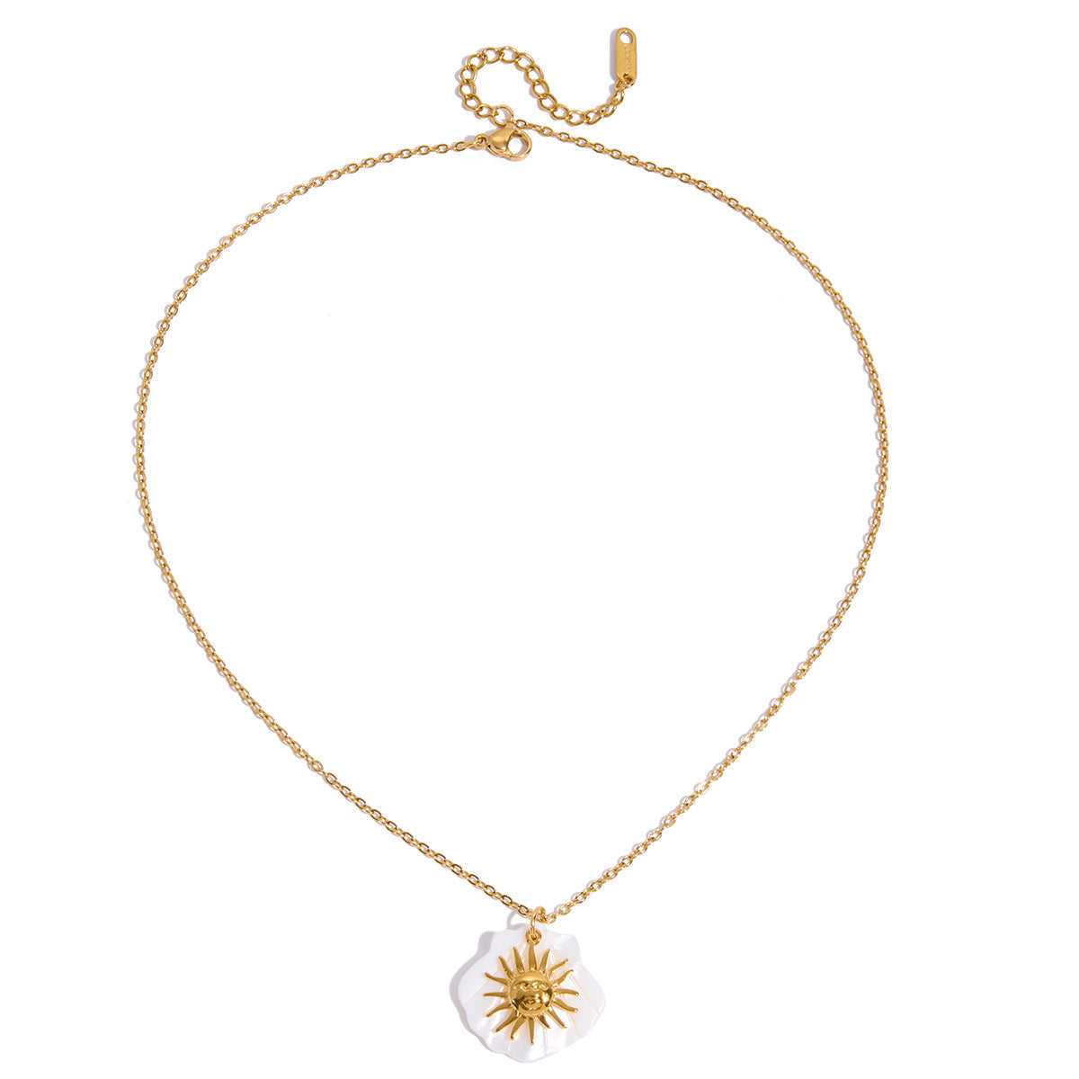 A celebration of oceanic mystique and warm, radiant light, the Zaniyah Pendant Necklace graces the décolletage with a touch of whimsical elegance. The luminous, shell-shaped mother-of-pearl beautifully frames the captivating golden sun emblem, creating a piece that feels like a precious treasure found on a sun-drenched shore. It is an exquisite statement for the woman who carries her own light and seeks jewelry imbued with sophisticated, feminine charm.