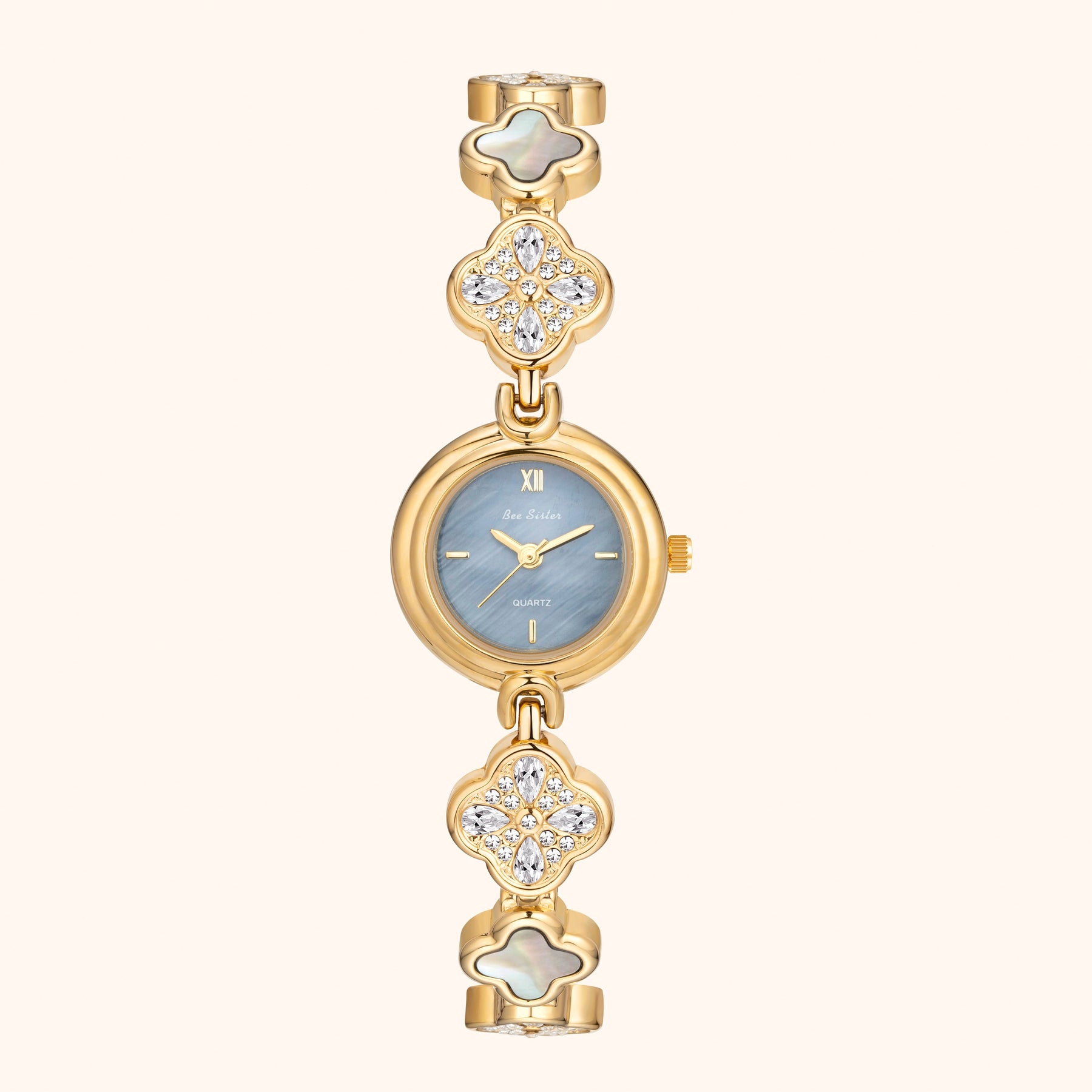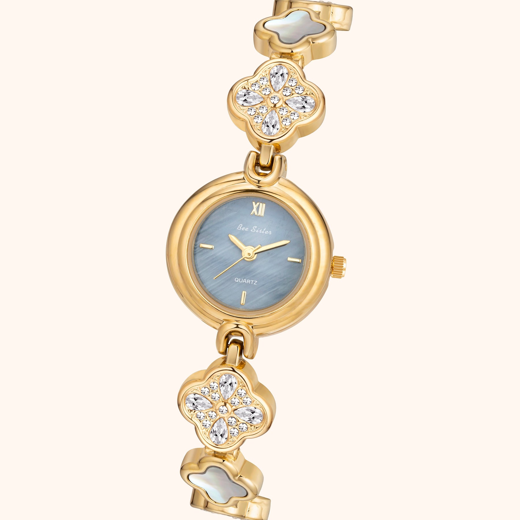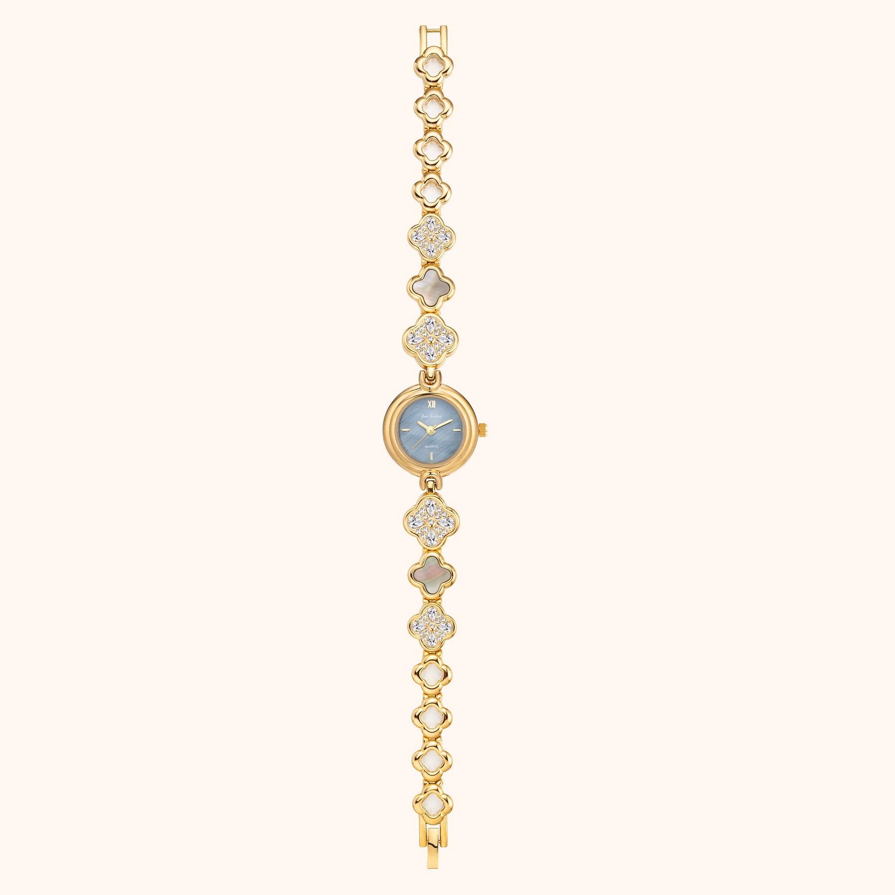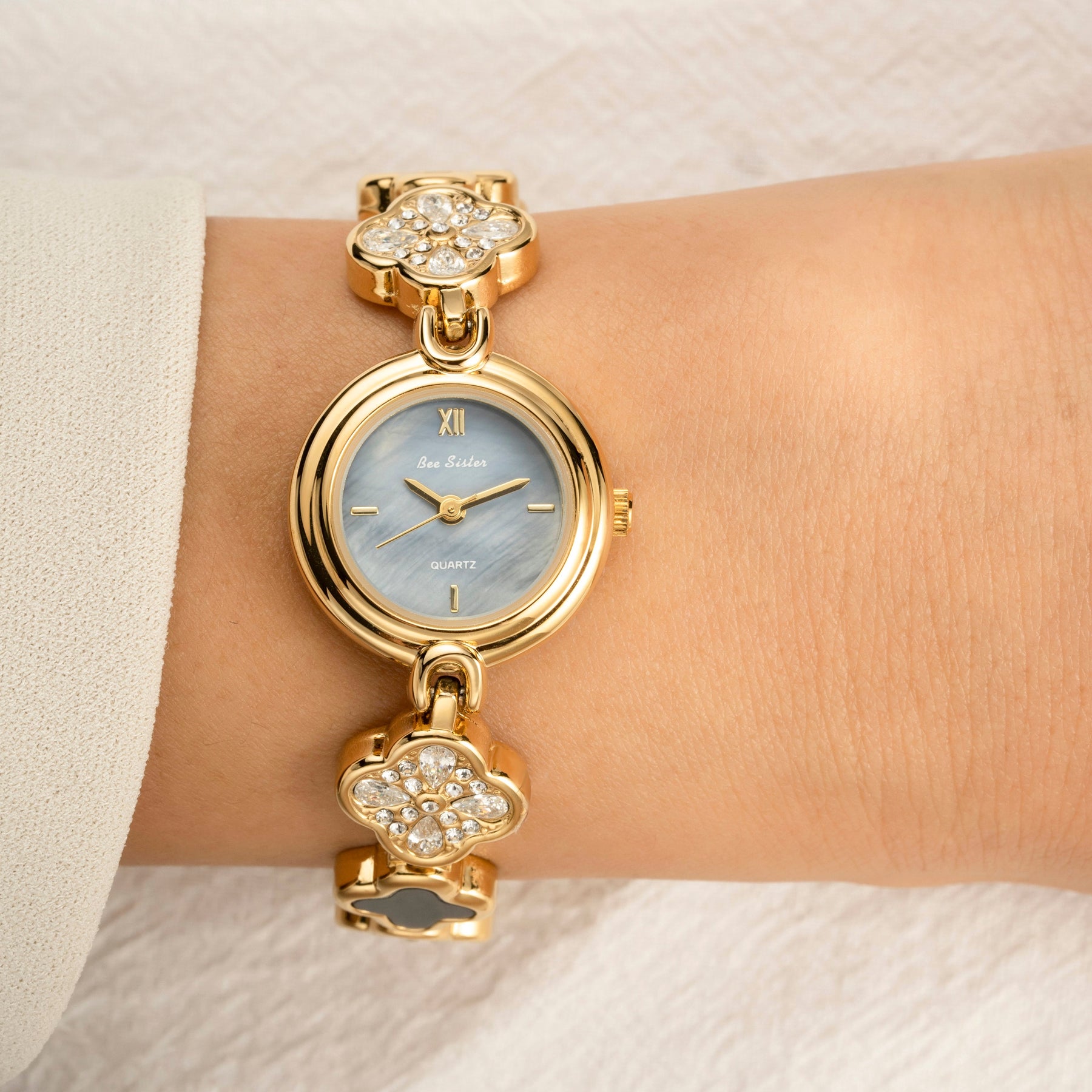 - Bracelet: Gold-plated bracelet with crystal and mother-of-pearl clover motifs, adjustable links, adjustable